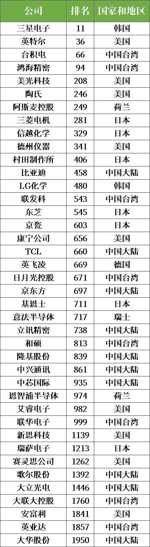 據(jù)統(tǒng)計,2000強榜單中有41家半導體相關公司其中包括中國大陸企業(yè)10家,中國臺灣企業(yè)9家。