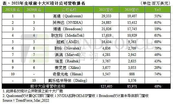 據(jù)TrendForce集邦咨詢研究顯示,2021年由于各類終端應用需求強勁導致晶圓缺貨,全球IC產(chǎn)業(yè)嚴重供不應求連帶使芯片價格上漲,拉抬2021年全球前十大IC設計業(yè)者營收至1,274億美元,年增48%。